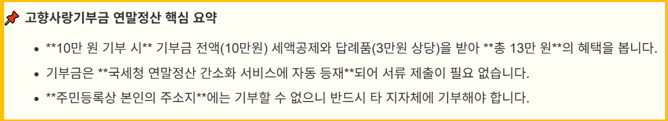 매년 연말정산 시즌, **고향사랑기부금**은 근로소득자라면 반드시 챙겨야 할 부분입니다. 단순 기부를 넘어, 세금 혜택과 지역 특산품이라는 실질적인 보너스를 모두 얻을 수 있어서인데요. 특히 10만 원까지는 **기부금 전액을 세액공제** 해주는 파격적인 혜택이 있어, 소액으로 최대 효과를 볼 수 있는 항목입니다. 지금부터 고향사랑기부금의 혜택 구조와 연말정산 완벽 공제 방법을 이해하기 쉽게 정리해 보겠습니다.