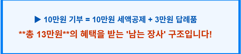 - 10만 원 이하 : 기부액의 100% 전액 세액공제 (지방소득세 10% 포함 시 총 110% 효과)