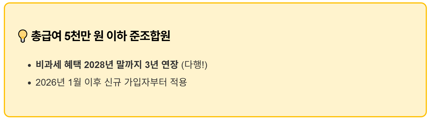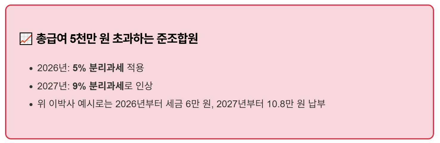 2026년부터는 연금이나 기타 소득을 모두 합한 총 급여 연간 5,000만 원(월 약 417만 원)을 넘느냐 넘지 않느냐에 따라서 혜택이 달라집니다. 아래 표에 간단히 정리해 두었는데요. 총급여가 연간 5,000만 원을 초과하는 준조합원분들은 2026년부터 이자나 배당의 5%의 세금을 내셔야 하고요. 이 세율은 2027년에는 9%로 인상이 됩니다.
