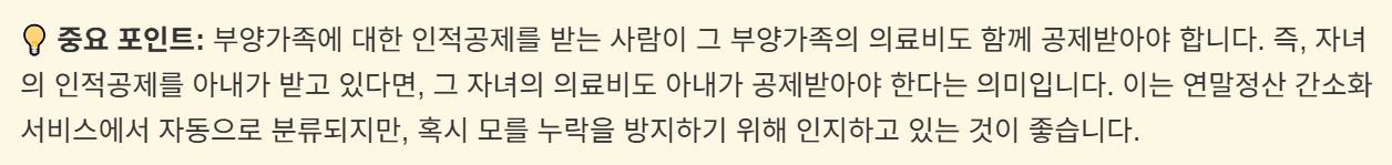 자녀나 부모님 등 부양가족의 의료비는 부부 중 한 명에게 합산하여 세금공제를 받게 되는데요. 이때, 주의해야 하는 점은 부양가족 공제(인적공제)를 받는 배우자에게 의료비까지 몰아줘야 한다는 것입니다.