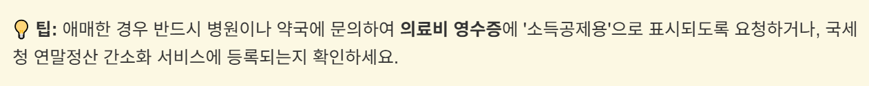 - 외국 의료기관에 지출한 의료비는 원칙적으로 공제 불가 (예외: 국외 근로자 등)