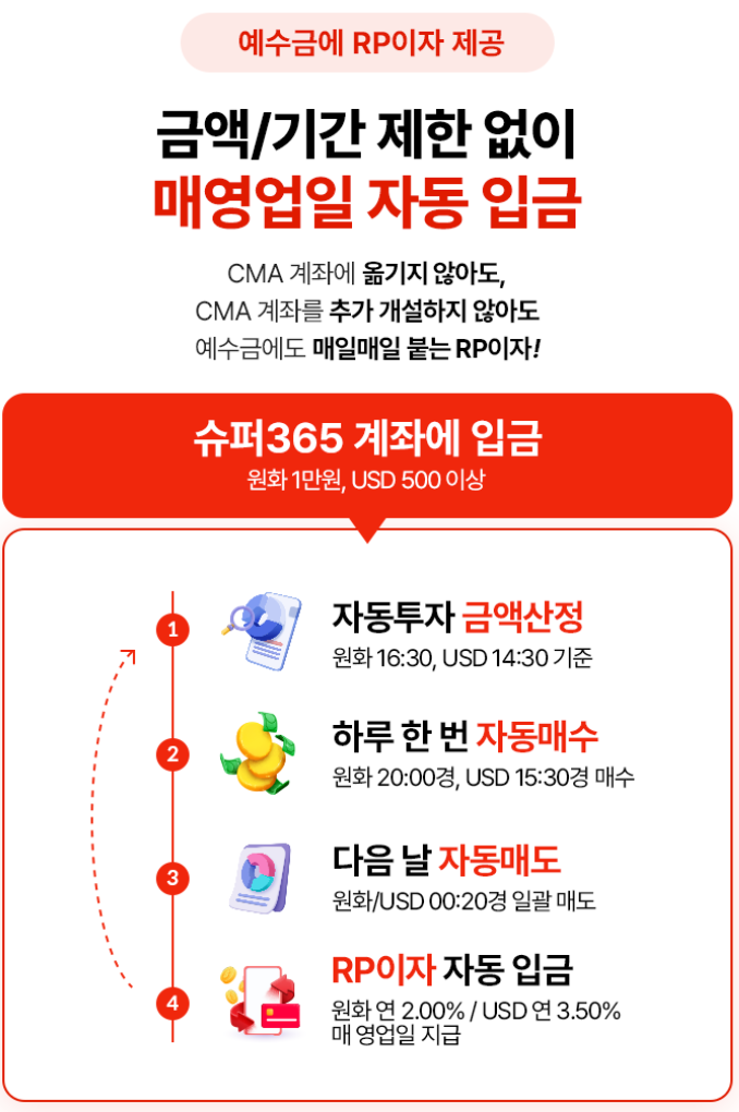 예수금이 증권 계좌에 그냥 남아 있을 경우, 타 증권사 경우 약 0.01% 정도의 이자만 지급해서 높은 이율의 이자를 받기 위해서는 CMA계좌로 보통 옮기는데 슈퍼365 계좌는 RP 수준의 이자를 지급한다고 하니 예수금을 따로 CMA 계좌로 옮길 필요가 없겠네요.
