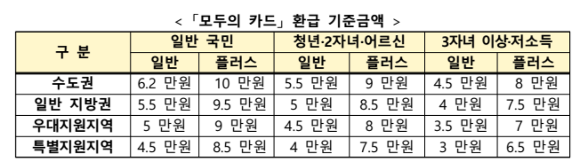 가장 큰 특징은 '지출 상한선(Cap)' 즉, 환급 기준금액이 생겼다는 것인데요. 한 달 동안 환급 기준금액을 초과하여 대중교통비를 지출한 경우, 초과분에 대해서 대해 모두 돌려받을 수 있습니다. 환급 기준금액은 지역별, 대상별로 차등 적용됩니다.
