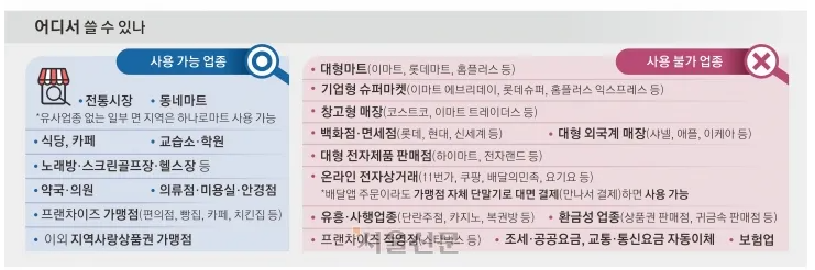 그 목적에 맞도록 연매출 30억 원을 초과하는 대형마트, 기업형 슈퍼마켓, 온라인 쇼핑몰, 배달앱등에서는 쓸 수 없고, 주소지 내 전통시장, 동네마트, 식당 의류점, 미용실, 안경점 등 영세 사업장에서 사용할 수 있습니다.