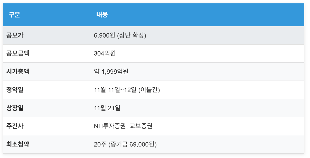 📅 청약일정: 11월 11일~12일 | 상장예정: 11월 21일 | 공모가: 6,900원