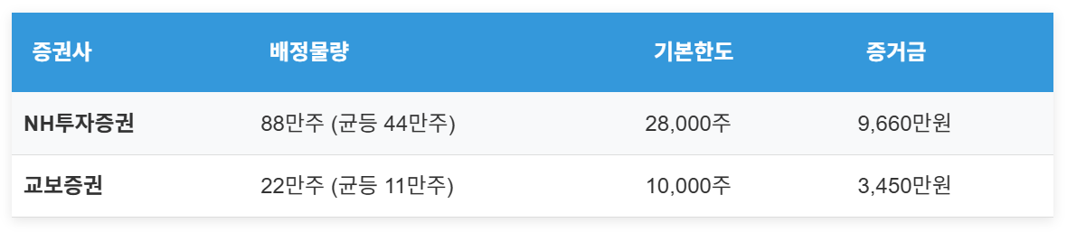 교보증권은 계좌수가 적어 균등 배정에서 2주 이상 받을 가능성이 높아 보이며, 균등 배정에 있어서는 교보증권이 NH투자증권보다는 유리할 수 있습니다.