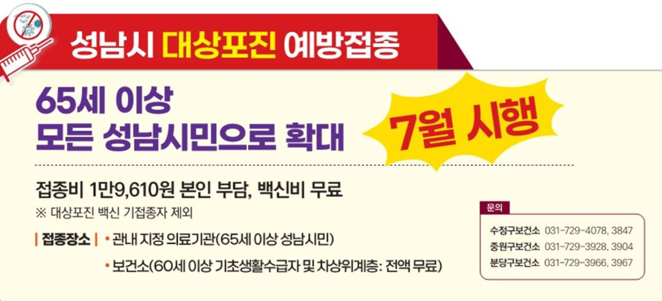 성남시는 2025년 7월 1일부로 대상포진 무료접종 대상자를 65세 이상 모든 성남시민으로 확대시행 하기로 결정했습니다.