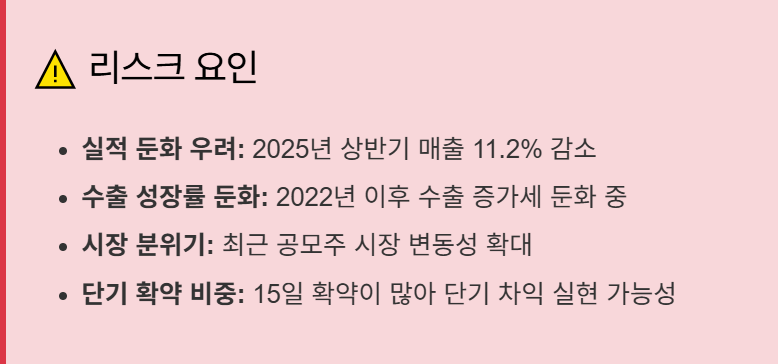 확약률이 60% 수준으로 양호한 편이지만,15일 단기 확약 비중이 약 35%로 높아 장기 투자보다는 단기 차익 실현 목적의 수요가 많았음을 알 수 있습니다. 즉, 장기보유 매력은 떨어지는 종목이라는 생각이 듭니다.
