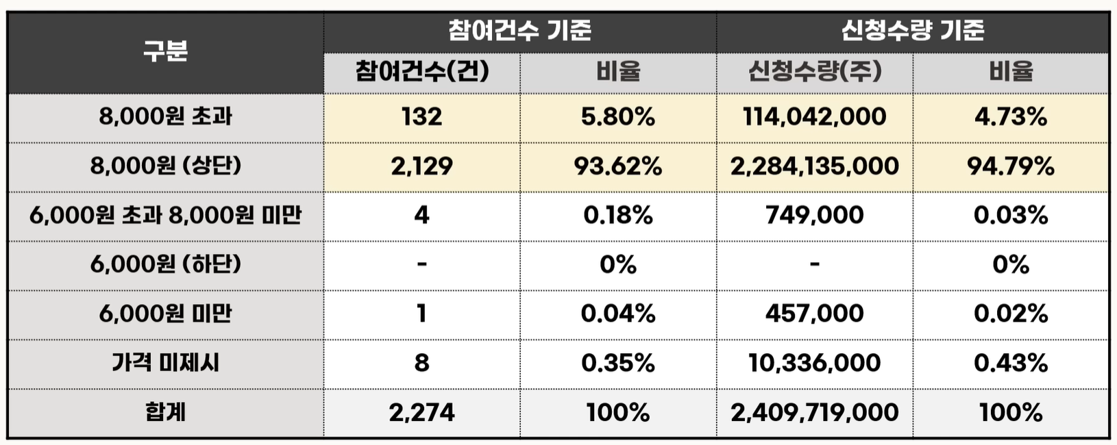 수요예측에서 1,152,98 : 1로 높은 경쟁률을 기록하였으나, 공모가 단가가 만원 미만으로 낮은 가격임에도 불구하고 일부 기관이 하단 미만으로 제시한 점은 부정적입니다.