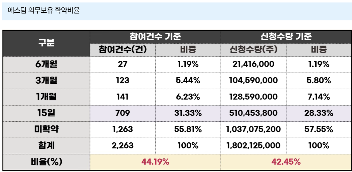 의무보유 확약비율은 참여건수 기준 44.19% / 신청 수량 기준 42.25% 로 그리 높지는 않으나, 워낙 공모규모가 작아, 최종 확약이 확정되고 나면, 유통 가능 물량은 100억 원대로 아주 가벼운 종목이 될 것으로 예상됩니다. 또한 확약기간이 거의 미확약 또는 15%에 집중적으로 모여 있음은 기관 투자자들도 단기수익을 노리고 빠져나올 가능성이 높습니다.