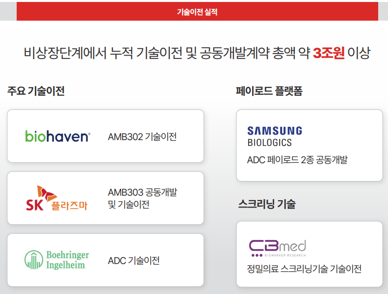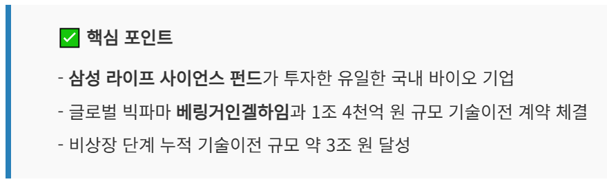 또한 괄목할 만한 부분은 비상장 단계에서 삼성/베링거인겔하임과 투자 및 기술 이전 계약이 체결되었다는 점입니다. 간략히 요약하면, 아래와 같습니다.