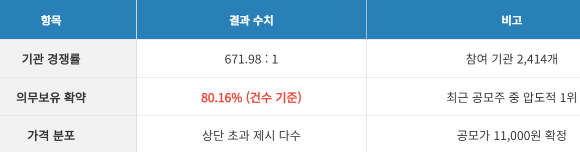 이번 수요예측의 하이라이트는 단연 의무보유 확약 비율인데요. 큐리오시스를 제치고 1등의 자리를 탈환했습니다. 확약 비율이 건수 기준 80%를 넘긴다는 것은 기관 투자자들이 이 종목을 단타용이 아닌, 중장기 보유 가치가 충분한 '알짜 종목'으로 판단했다는 근거라고 볼 수 있습니다. 최종 배정 시 확약 비율은 95% 이상으로 올라가리라 기대됩니다.