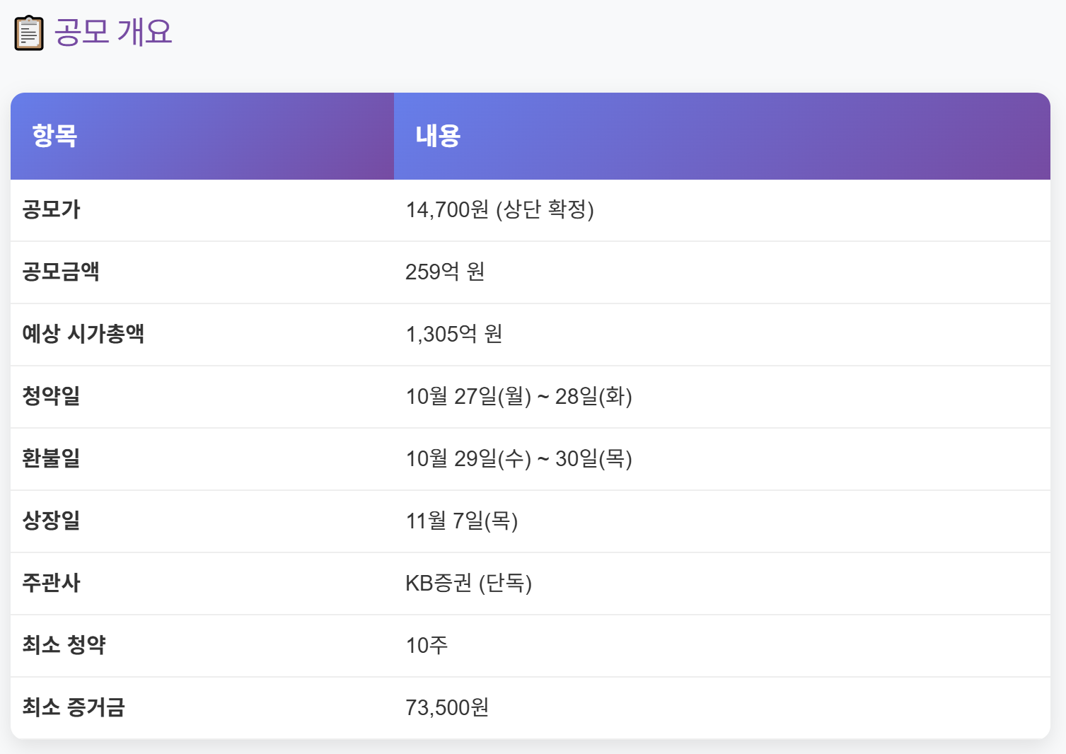 아래 자세한 공모개요 참고해 주세요. 참고로, KB증권 청약조건도 같이 정리해 두었습니다.
