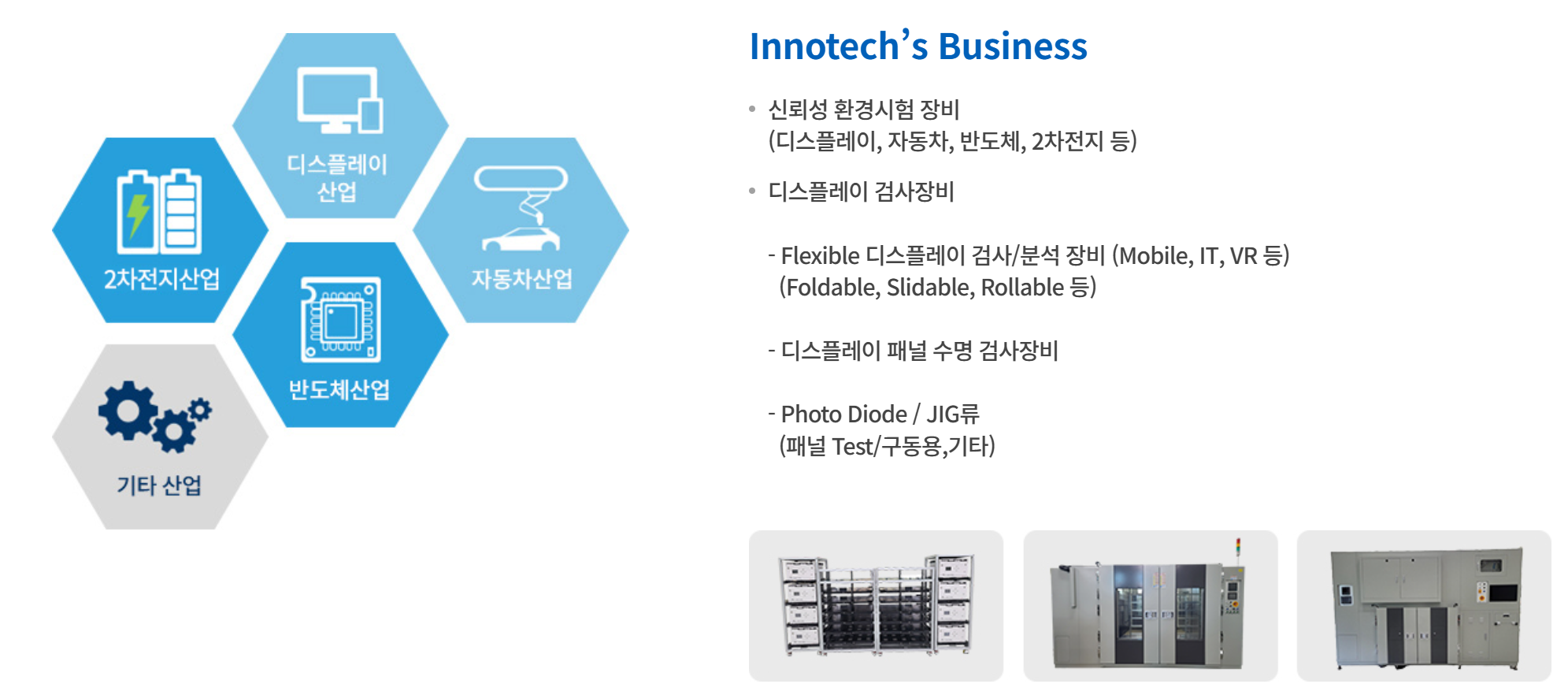 이노테크는 복합 신뢰성 환경시험 장비 전문 기업으로, 전자제품의 품질 검증에 필요한 장비를 생산하는 회사입니다. 영하 70도에서 250도까지의 극한 환경에서 제품 결함을 검사하는 이 장비는 디스플레이, 반도체, 2차 전지, 자동차 등 주요 산업에서 안정적인 양산과 고품질 제품 출시를 위해 꼭 필요한 설비라고 합니다