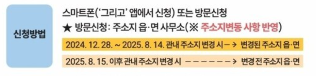 - 2024년 12월 28일~2025년 8월 14일 사이 이전 → 변경된 주소지 읍·면사무소에서 신청