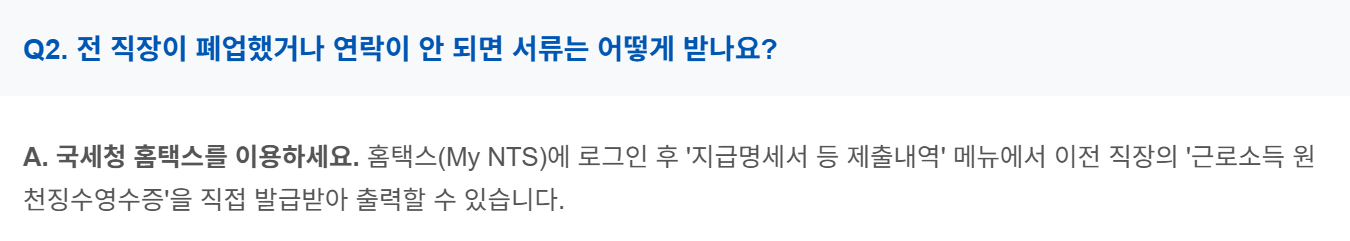 - STEP 1. 전 직장 원천징수영수증 발급 : 전 직장에 요청하는 것이 가장 확실합니다. 연락이 어렵거나 폐업한 경우, **국세청 홈택스 (My NTS > 지급명세서 등 제출내역)**에서 직접 발급받으실 수 있습니다.