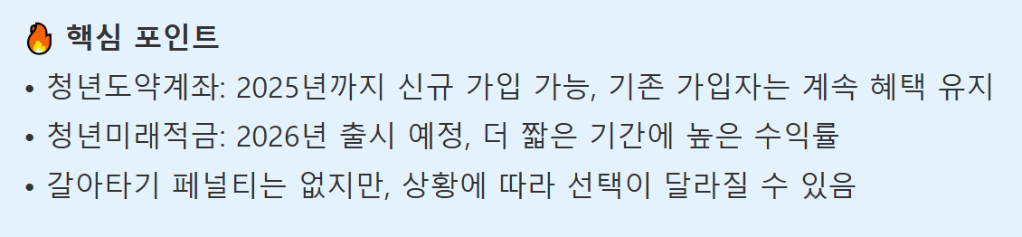 - 시기 고려: 청년미래적금은 2026년부터 시작이므로 공백기간 발생