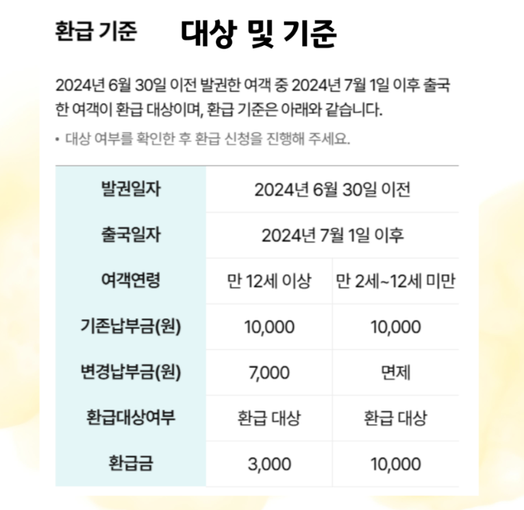 특히 항공권을 6월 30일 이전에 결제하고, 실제 출국일이 7월 1일 이후인 분들이라면 대부분 환급 대상에 해당된다고 보셔도 무방합니다. 성인은 3천 원, 어린이는 무려 1만 원까지 환급이 가능하니 이 글을 끝까지 읽어보시고 꼭 꼭 신청하세요!!
