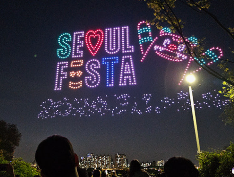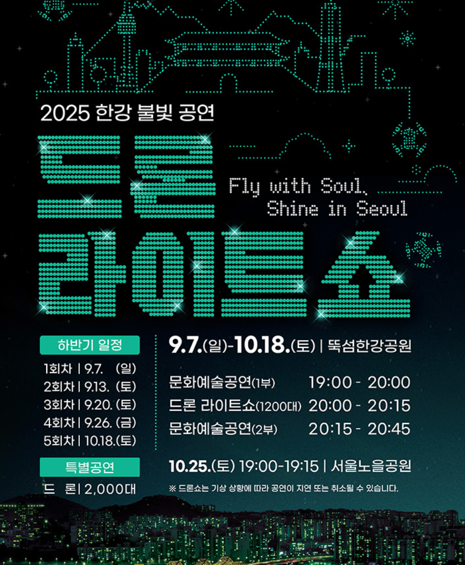 이번 드론라이트쇼는 9월 7일을 시작으로 10월 18일까지 총 5회차에 걸쳐 뚝섬한강공원에서 있을 예정이고, 본격적인 드론쇼에 앞서 저녁 7시에는 '케이팝 데몬 헌터스' 커버댄스와 노래를 포함한 문화 예술공연이 진행될 예정입니다. 또한, 특별 의상과 페이스페인팅을 활용한 포토 인증숏 이벤트도 마련되어 있다고 합니다.