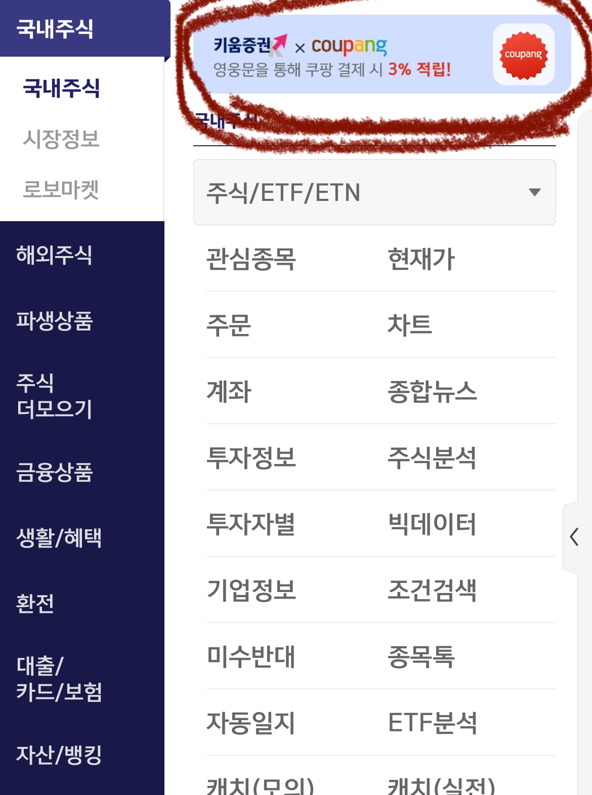 키움앱을 들어가보니 제가 아래 캡처해놓은 쿠팡 배너가 없어졌더라구요.