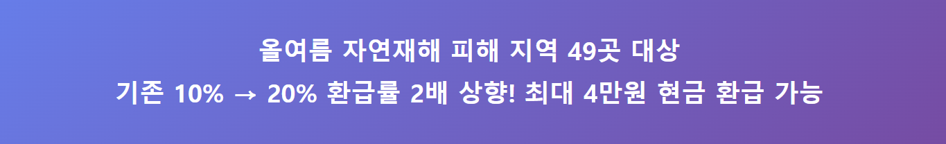 올해 7~8월 연이은 태풍과 집중호우로 49개 시군이 특별재난지역으로 지정이 되었습니다. 재난 지역의 소상공인들은 시설 복구비 부담과 고객 감소라는 이중고에 시달리고 계신 상황인데요. 정부는 이런 상황을 해결하기 위해 기존 온누리상품권 환급률 10%에서 20%로 상향시키기로 결정했습니다. 20% 환급을 받을 수 있는 49개 대상 지역은 아래와 같습니다.