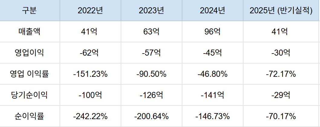 에스투더블유이 매출은 2022년 41억 원에서 2024년 96억 원까지 꾸준히 성장하고 있으나, 아직 100억 원에 미치지 못하는 규모입니다. 2018년 설립 이후 매출이 꾸준히 성장하고 있지만, 아직 흑자 전환에 성공하지는 못한 상황입니다. 2025년 반기실적을 보아도, 매출, 영업이익이 크게 향상되었다고 볼 수는 없습니다. 에스투더블유는 지속적인 적자를 기록하고 있고, 불안정한 수익성이 가장 큰 리스크라 볼 수 있어, 장기투자 목적으로 보유하기에는 무리가 있어 보이는 종목입니다.
