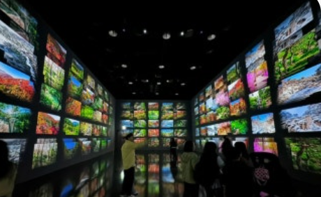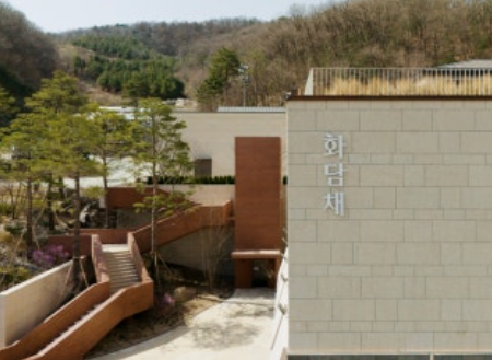 화담채는 화담숲의 관문 역할을 하는 건물로, 미디어아트관과 전시공간으로 나뉘어 있습니다.. 약 530평 규모의 이 공간에서는 다양한 예술작품을 감상할 수 있으며, 옥상정원에서는 화담숲 전경을 한눈에 보실 수 있습니다.