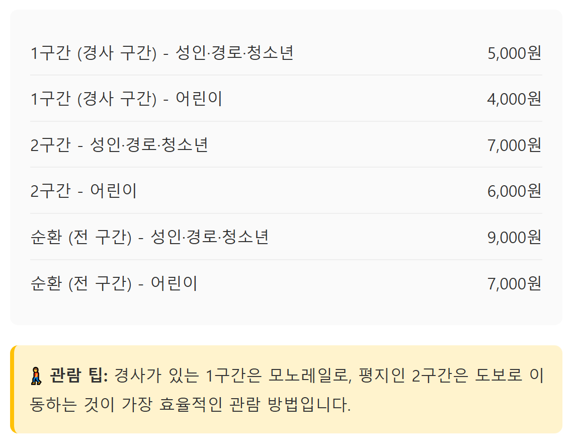 모노레일 요금은 구간별로 다릅니다. 1구간(경사 구간)은 성인·경로·청소년 5,000원, 어린이 4,000원이며, 2구간은 각각 7,000원과 6,000원입니다. 전 구간을 이용하는 순환권은 성인·경로·청소년 9,000원, 어린이 7,000원입니다. 특히 경사가 있는 1구간은 모노레일로, 평지인 2구간은 도보로 이동하는 것을 추천드립니다.