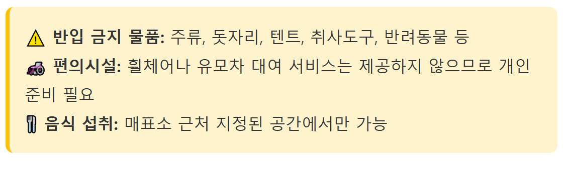 비가 오는 날에도 관람이 가능하며, 편의점에서 우산이나 우의를 구매할 수 있습니다만, 낙뢰 시에는 모노레일 운행이 불가능합니다. 주류, 돗자리, 텐트, 취사도구 등은 반입이 금지되며, 반려동물 동반 입장도 불가능합니다. 휠체어나 유모차 대여 서비스는 제공하지 않으므로 필요한 경우 개인적으로 따로 마련하셔야 합니다. 음식물은 화담숲내 반입이 금지되어 있으니, 음식물은 매표소 근처 지정된 공간에서만 섭취 가능합니다.