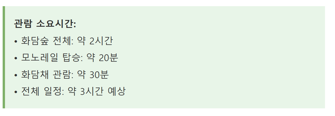 전체 1,213미터 순환선으로 이루어진 화담숲 모노레일은 약 20분간 운행되며, 이끼원 입구에서 화담숲 정상과 분재원을 거쳐 돌아오는 코스로 구성되어 있습니다.