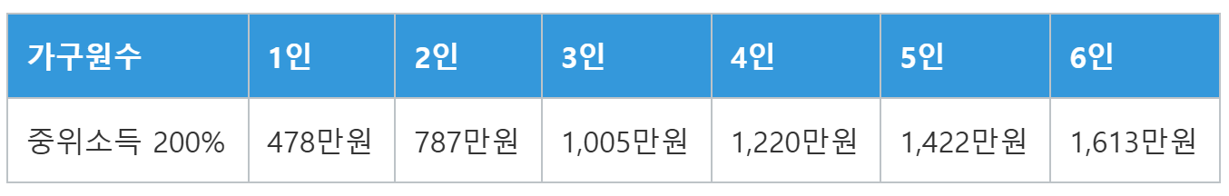- 소득조건 : 연소득 6,000만원 이하 또는 중위소득 200% 이하 (중위소득 200% 기준은 아래를 봐주세요)