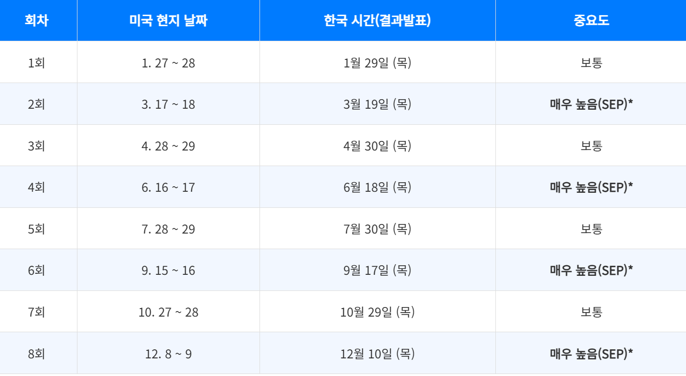 미국 FOMC는 보통 이틀간 회의를 거쳐 한국 시간으로 둘째 날 새벽 3시(일정 시기에 따라 4시)에 결과가 발표됩니다. 특히 별표(*)가 표시된 달은 경제전망(SEP)과 점도표가 공개되어 시장의 향방이 결정되는 날이니, 좀 더 관심을 가져보시는 게 좋겠습니다.