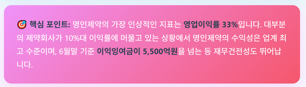 명인제약의 재무현황을 살펴보면 매우 안정적이고 수익성 높은 기업입니다. 명인제약의 가장 인상적인 지표는 **영업이익률 33%**인데요. 대부분의 제약회사가 10%대 이익률에 머물고 있는 상황에서 명인제약의 수익성은 업계 최고 수준이라 할 수 있는 상황입니다. 또한 6월 말 기준 이익잉여금이 5,500억 원을 넘으니 연환산하면, 올해 1,000억 원을 돌파할 수 있으리라 생각됩니다.