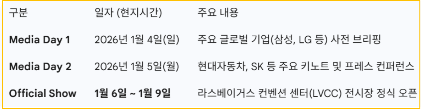 CES 2026은 공식 개막 전 '미디어 데이'를 통해 대기업들의 굵직한 기조연설이 먼저 진행되고 구체적인 일정은 다음과 같습니다.