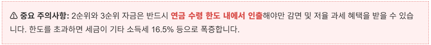 인출 신청시 반드시 어느 자금을 인출할 건지 지정하셔야 하는데요. 세금 부담을 최소화하려면 다음의 **전략적 순서**를 따르는 것이 가장 유리하니, 아래 표는 꼭 꼭 기억하시기 바랍니다. 또한 아래 언급 드리는 대로, 반드시 연금 수령 한도 내에서 인출하셔야 혜택을 받으실 수 있는 점, 꼭 기억하시기 바랍니다.