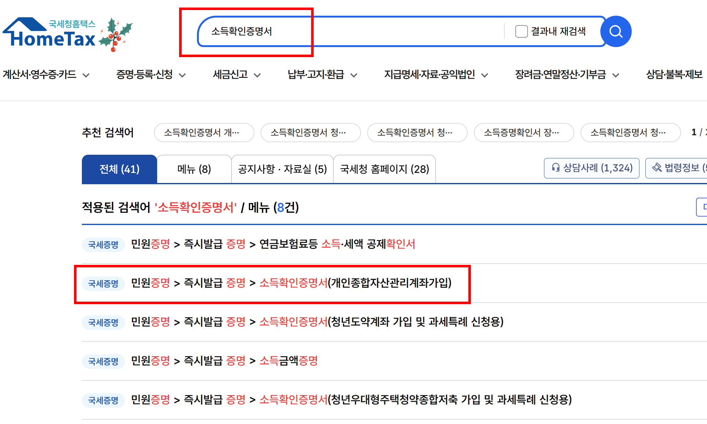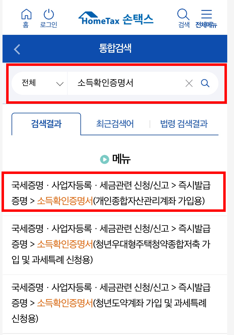 - 검색창에서 검색 : 검색창에서 "소득확인증명서" 검색