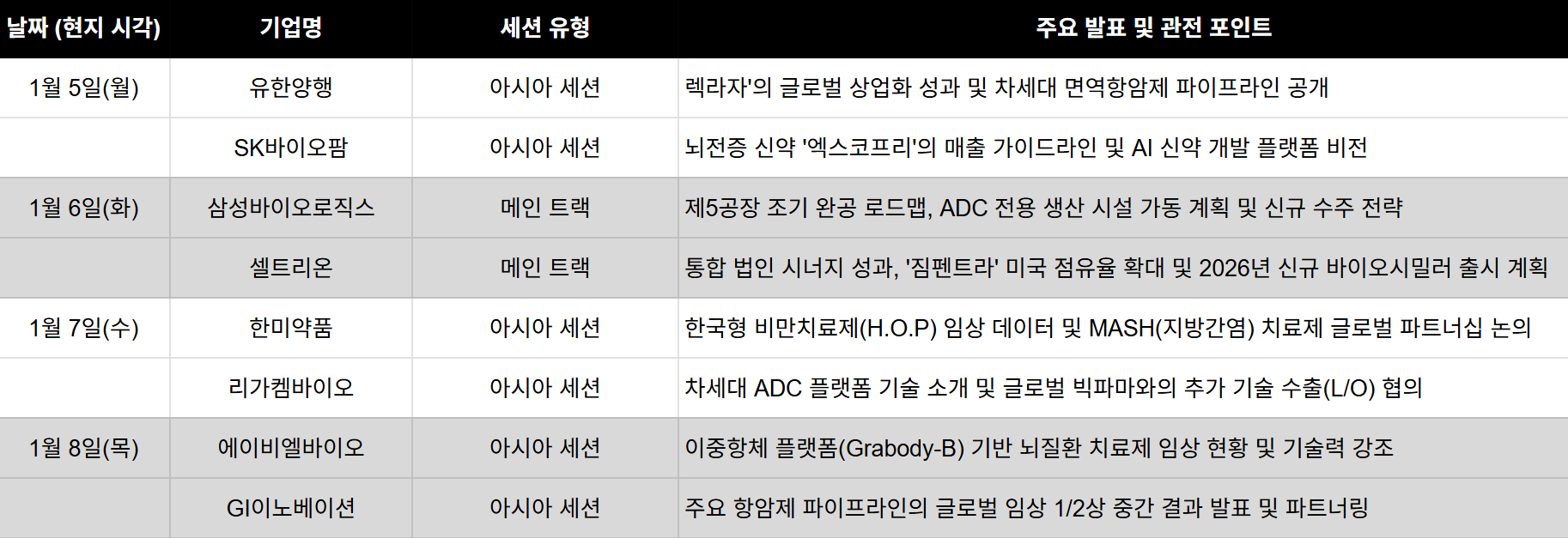 이번 JP 모건 헬스케어 컨퍼런스에 참여하는 한국 기업들의 발표 일정과 주요 발표 내용은 아래와 같습니다.