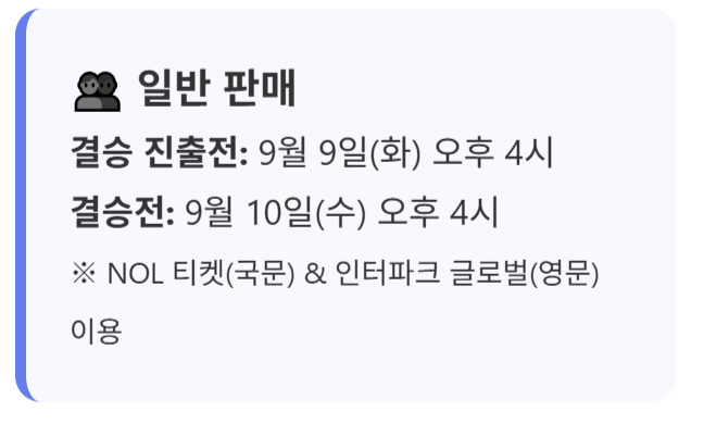 일반 판매의 경우 9월 9일 오후 4시부터 결승 진출전 예매가 시작되고 9월 10일 오후 4시부터는 결승전 티켓 예약이 시작됩니다. 일반 판매의 경우 NOL 티켓(국문 사이트)과 인터파크 글로벌(영문 사이트)을 통해 예매할 수 있다.