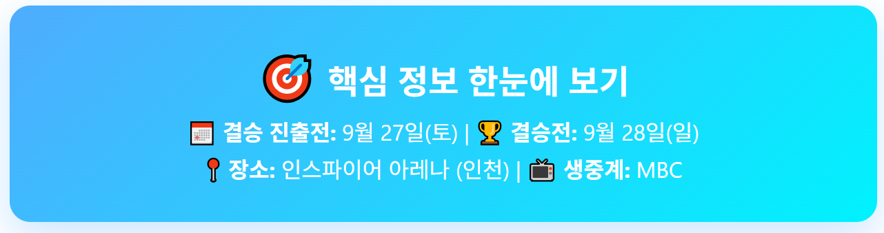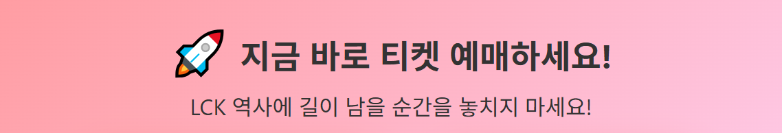 LCK 역사상 처음으로 단일 시즌 챔피언을 선발하는 2025 우리은행 LCK 결승 진출전과 결승전이 오는 9월 27일(토)과 28일(일) 이틀에 걸쳐 인스파이어 아레나에서 개최됩니다. 9월 9일(화) 오후 4시부터 결승 진출전, 10일(수) 오후 4시부터 결승전의 티켓 예매가 각각 시작하는데요. 자세한 결승전 일정, 티켓 예매 일정 및 티켓 가격 정보 등을 빠르게 알아보겠습니다.